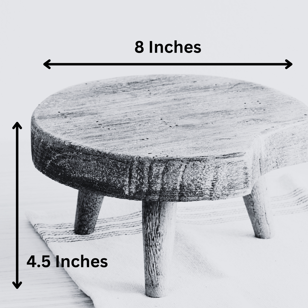 The Rustic Wood Riser measures at 4.5" tall with a diameter of 8".